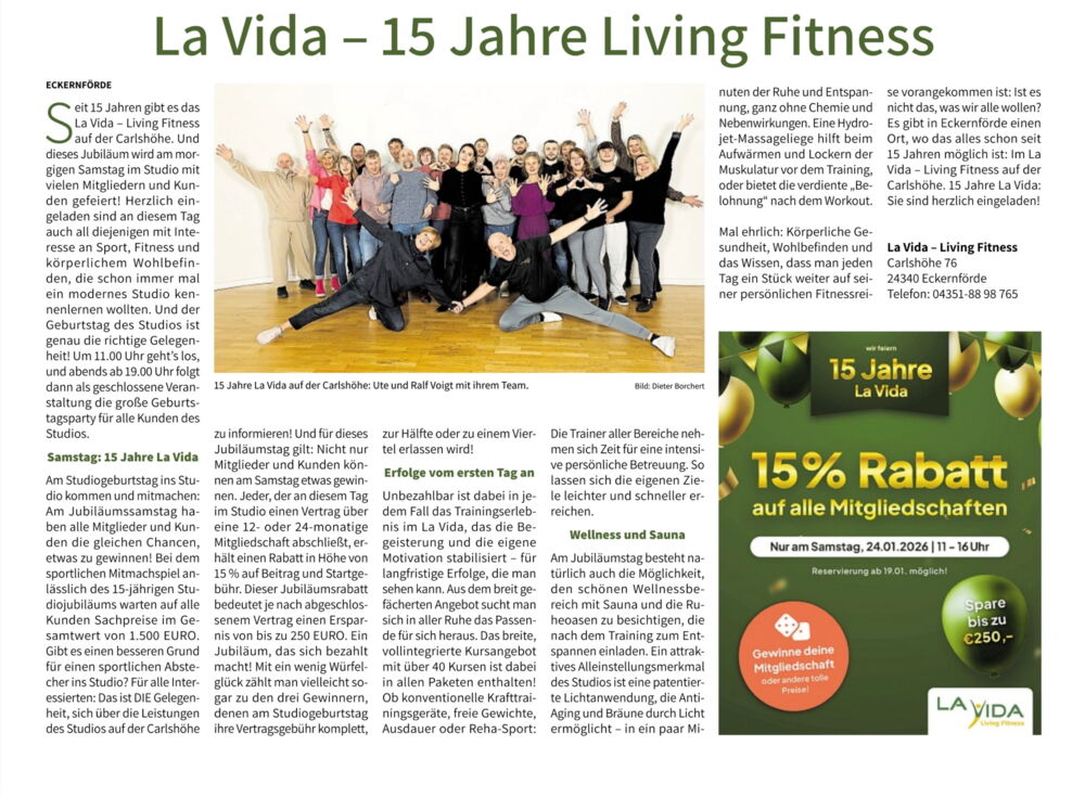 Seit 2011 Jahren erfolgreich in der Carlshöhe, sind Ute und Ralf Voigt erste Ansprechpartner in allen Sachen rund um Fitness und Ernährung in Eckernförde. Gemeinsam bringen sie es auf 50 Jahre Berufserfahrung, eröffneten sie am 1. März 1996 gemeinsam ihr erstes Studio.